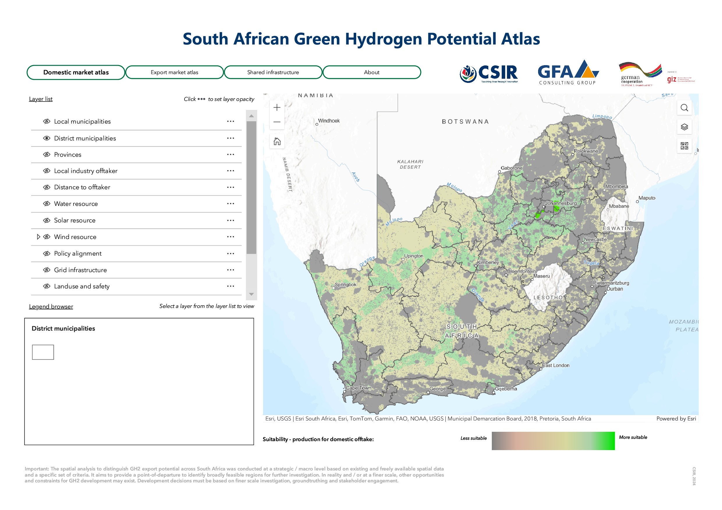 The South African Green Hydrogen Potential Atlas is one such tool that aims to support the spatial planning of green hydrogen developments. It is the product of a multi-criteria analysis which considered spatially explicit key siting variables that represent environmental conditions and sensitivities, different uses and users of the environment, and the requirements for green hydrogen production. The atlas showcases the potential for green hydrogen production aimed at export and domestic markets and additionally shows where enabling shared infrastructure could be leveraged to create a South Africa green hydrogen economy.