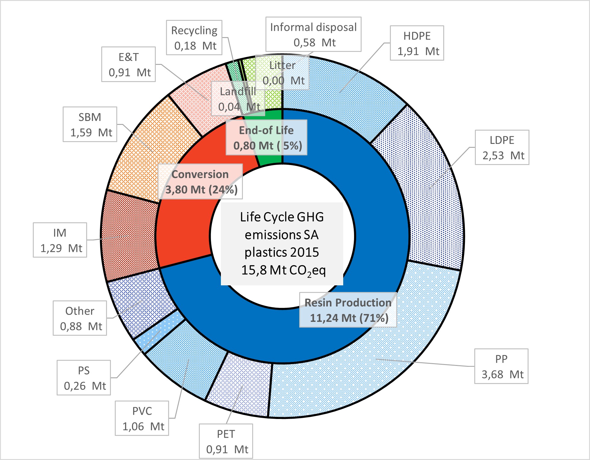 Setting the reference year to 2015, results indicate that the South African plastics sector emitted an equivalent of 15.8 megatons of CO2, with the granulate production stage responsible for the highest environmental load due to the local context where both electricity and monomer production are coal-based. Additionally, the findings showed that the practice of burning plastic waste also had a significant contribution. Furthermore, the process of recycling plastics can save approximately 1.4 megatons of GHG due to avoided virgin polymer production.