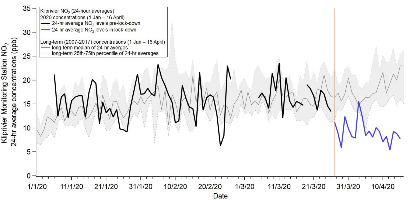“Assessing the impacts of the lockdown on ground-level concentrations is complex. However, it is critical in order to understand how pollution affects people’s health. One aspect that we have to consider is that ground-level pollution concentrations generally increase over this period in the run-up to winter. In order to account for that, we are looking at comparing measurements from January 2020 until now to average measurements from previous years. An example of this analysis is highlighted by our preliminary look at the Kliprivier monitoring station in Gauteng (see attached Figure 2). When comparing concentrations before lockdown to those seen in previous years, the concentration levels were similar. However, when comparing the NO2 concentrations from during lockdown to previous years, we saw a decrease in the 24-hour average NO2 concentrations. We did not see such a decrease in the SO2 24-hour average concentrations. This could be because the monitoring station is impacted by emissions from traffic, that would affect NO2 concentrations more than SO2, but it is not strongly impacted by coal-fired power plants that are large sources of SO2. However, analysis is continuing to quantify reasons for these changes”, says CSIR principal researcher, Prof. Rebecca Garland.
