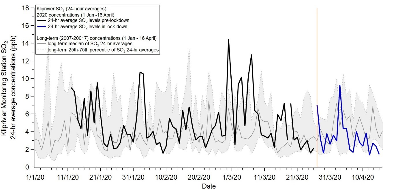 Figure 2: Preliminary analysis of daily averages for ambient NO2 (top) and SO2 (bottom) concentrations at the Kliprivier site in Gauteng. The black lines show the 24-hour average values pre-lockdown (1 January to 16 April 2020), the light orange vertical lines show the start of lockdown (27 March 2020), and the blue lines show the 24-hour average values after lockdown (27 March 2020 to 16 April 2020). The light gray solid lines show the long-term median values of the 24-hour averages for 1 January to 16 April for 2007-2017. The grey shading extends to the 25th percentile (on the bottom) and the 75th percentile values (on the top) of the long-term 24-hour averages. This information on the long-term concentrations highlights the “expected” range of pollution levels during this time. This is a preliminary analysis to start to understand if changes are seen in pollution concentrations during lockdown. Air quality data were downloaded from http://saaqis.environment.gov.za/.