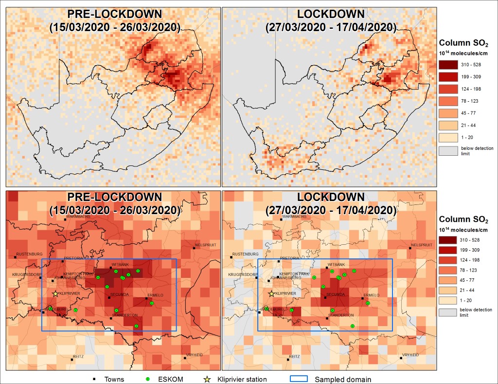 The preliminary analysis of the satellite data shows that there has been a decrease in the column of tropospheric nitrogen dioxide (NO2) and sulfur dioxide (SO2). This data was obtained from the Earth Observing TROPOMI instrument on the Sentinel-5P satellite (see attached Figure 1). Over the Highveld, NO2 concentrations decreased by 23% after the lockdown (27 March to 20 April 2020) compared to before (10-26 March 2020), and SO2 concentrations are 47% lower. The SO2 data only extends to 17 April 2020.