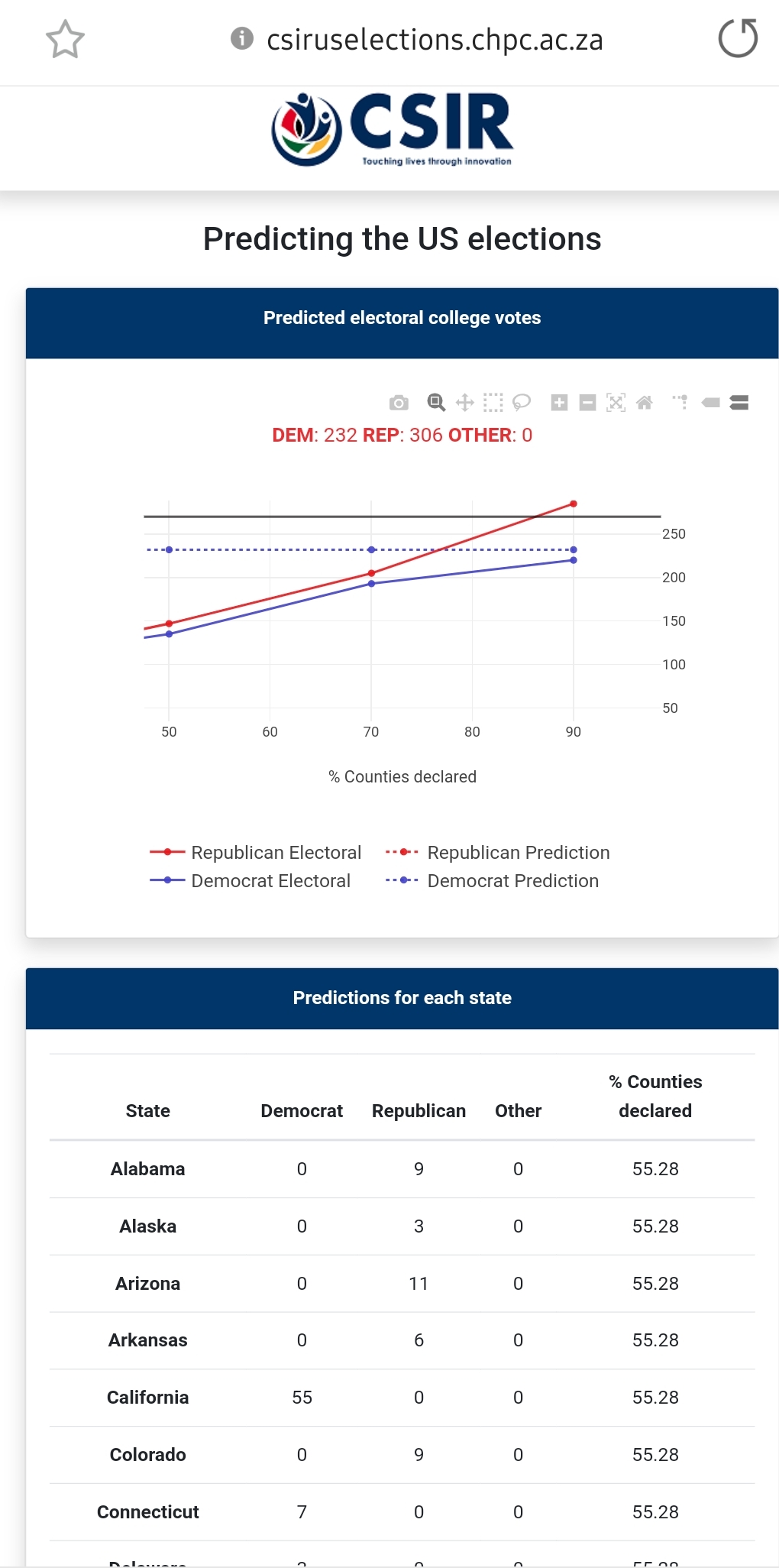 For this year’s election the CSIR will provide a live forecasting of the US Presidential elections taking place on 3 November 2020. The forecast will be accessible on the CSIR website from as soon as the results become available on the Politico website on 3 November 2020.